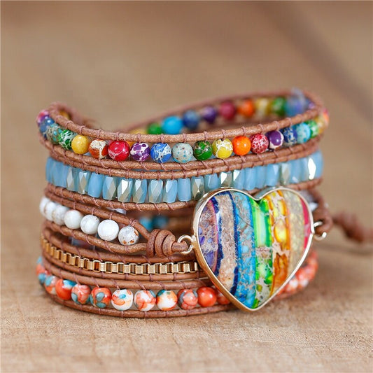 Natural 7 Chakras Jasper & Agate Heart Leather Wrap Bracelet