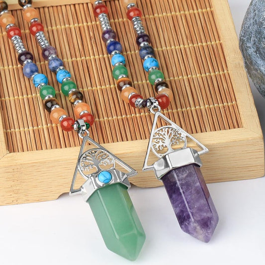108 Natural Amethyst and Chakras Beads Necklace with Tree of Life