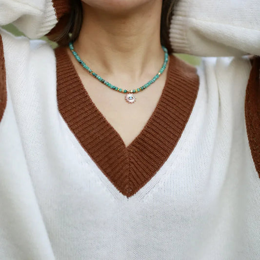 Natural Amazonite & Kiwi Jasper Evil Eye Choker Necklace