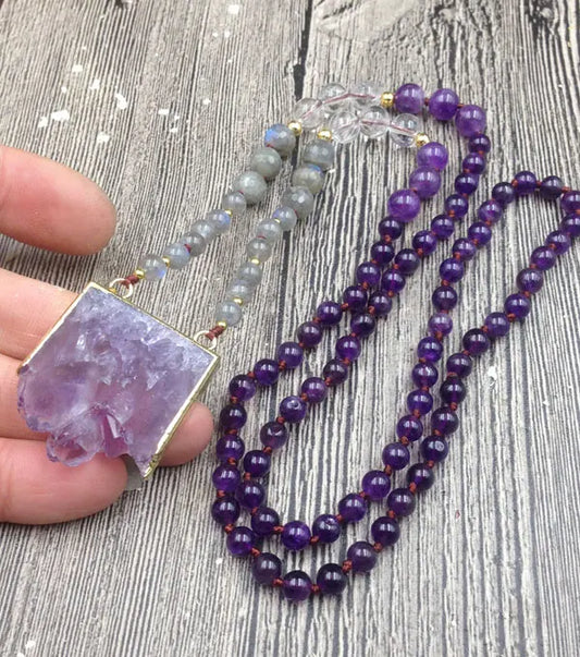 Natural Amethyst, Labradorite, Clear Quartz Druzy Necklace