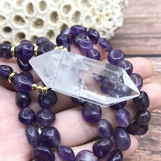 Natural Amethyst Mala Necklace & Clear Quartz Double Point Pendant