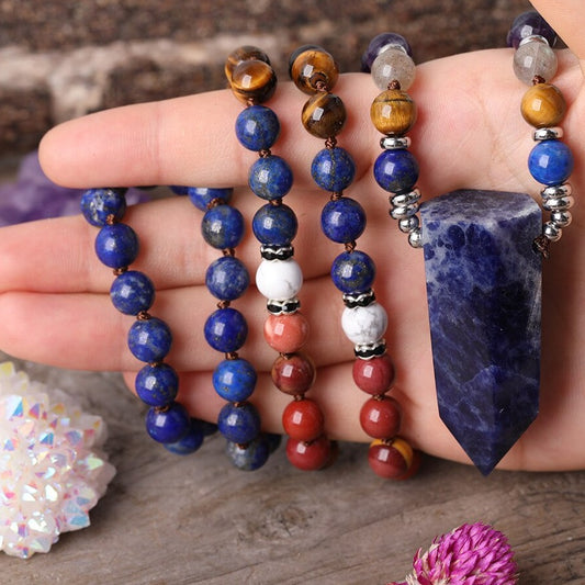 Natural Amethyst, Tiger Eye, Lapis Lazuli, Jasper Necklace with Sodalite Stone Pointed Pendant