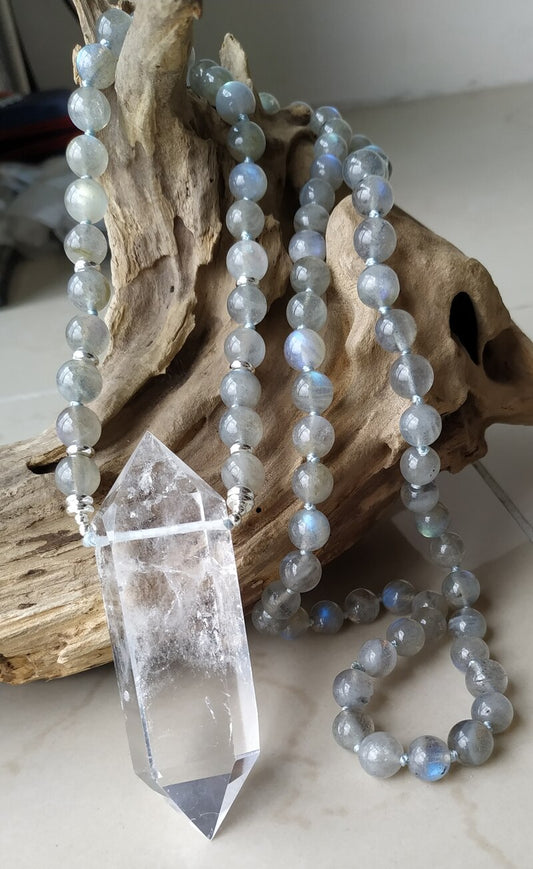 Natural Clear Quartz Double Point Pendant & Labradorite Stone Beads Necklace