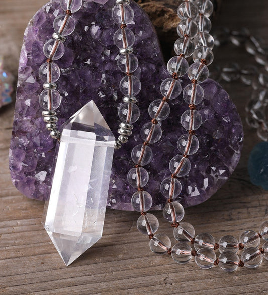 Natural Clear Quartz Beaded Necklace with Double Point Quartz Pendant