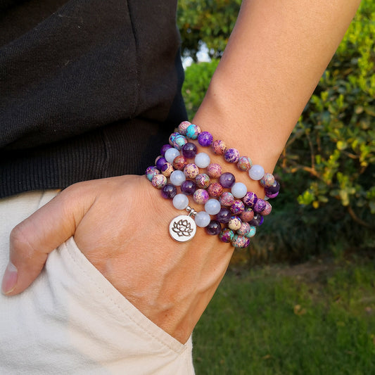 Natural Light Blue Agate, Purple Jasper & Amethyst 108 Beads Mala