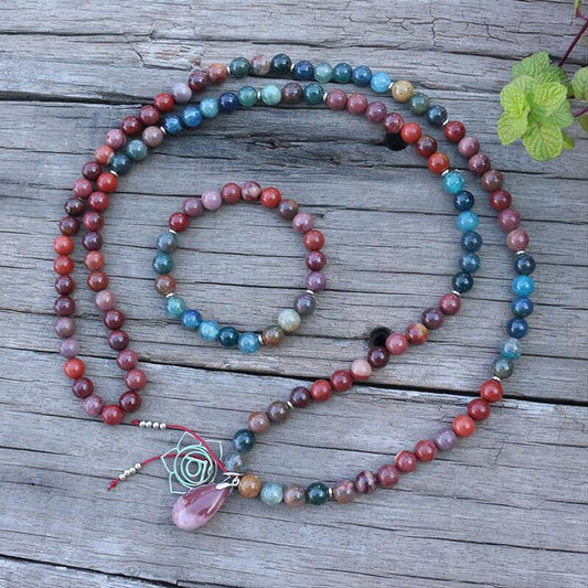 Natural Mookite, Indian Agate, Onyx & Apatite 108 Beads Mala Necklace / Bracelet
