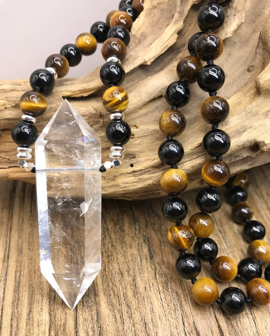 Natural Black Tourmaline, Tiger's Eye & Clear Quartz Double Point Pendant Necklace