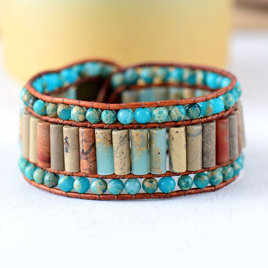 Natural Amazonite, Jasper & Agate Leather Wrap Bracelet