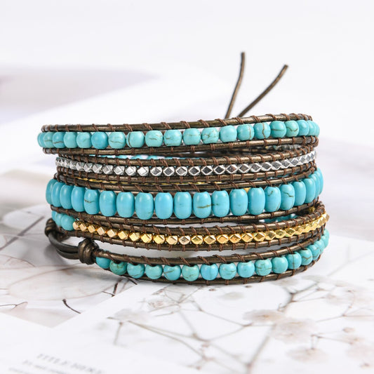 Natural Turquoise Jasper & Brass Beads Leather Wrap Bracelet