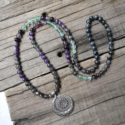 108 Natural Amethyst, Fluorite & Labradorite Mala Bead Necklace / Bracelet