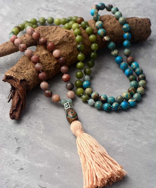 Natural Jasper, Amethyst & African Turquoise 108 Mala Beads Necklace