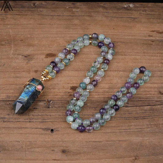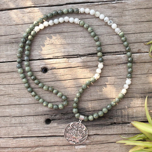 Natural Labradorite & White Quartz 108 Mala Beads Necklace