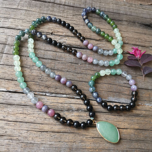Natural Iolite, Jade, Onyx, Prehnite, Agate & Aventurine 108 Beads Mala Necklace / Bracelet