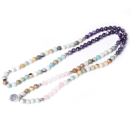 Natural Amethyst, Rose Quartz & Amazonite 108 Mala Beads Necklace / Bracelet
