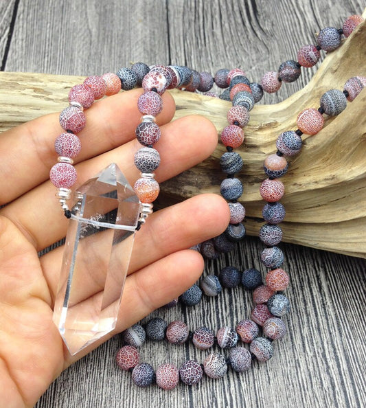 Natural Dragon Vein Agate & Clear Quartz Double Point Pendant Necklace
