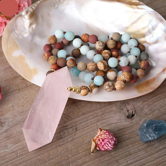 Natural Tiger Eye, Rose Quartz, Rhodonite & Amethyst 108 Beads Mala Necklace / Bracelet