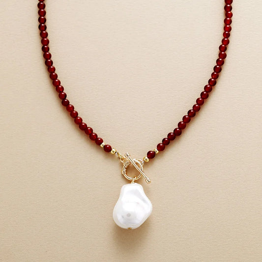 Natural Red Agate & Freshwater Pearl Lariat Necklace
