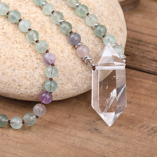 Natural Rainbow Fluorite & Clear Quartz Double Point Pendant Necklace
