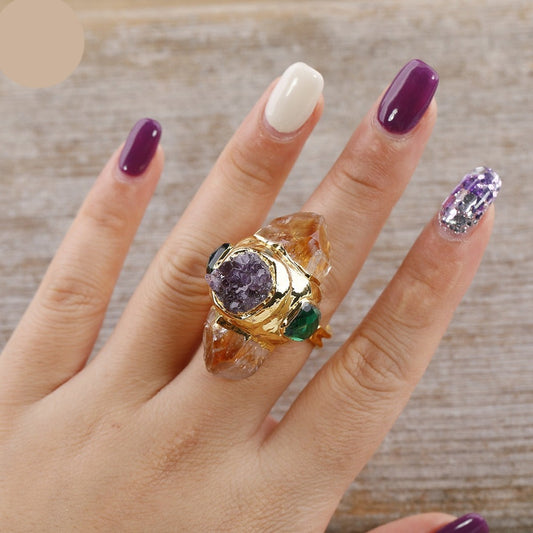 Natural Hexagonal Amethyst / Clear Quartz / Citrine Ring