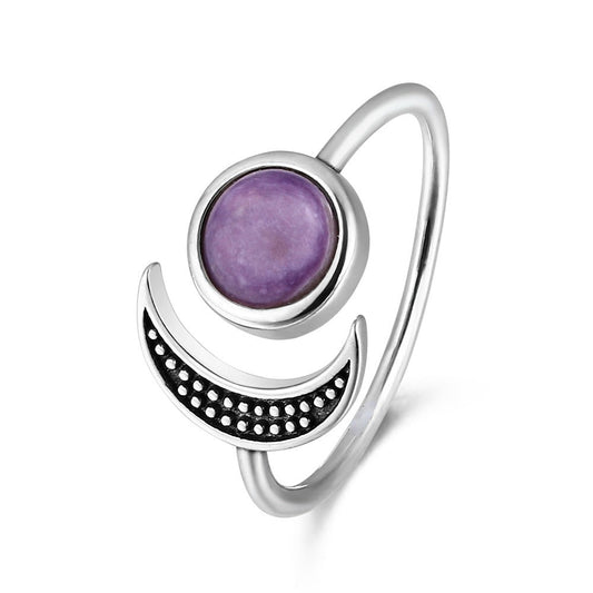 Natural Charoite Stone Adjustable Silver Moon Ring