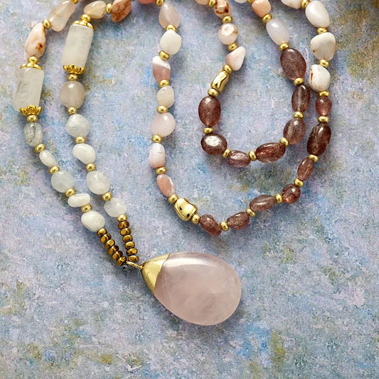 Natural Strawberry Quartz, Agate & Rose Quartz Necklace