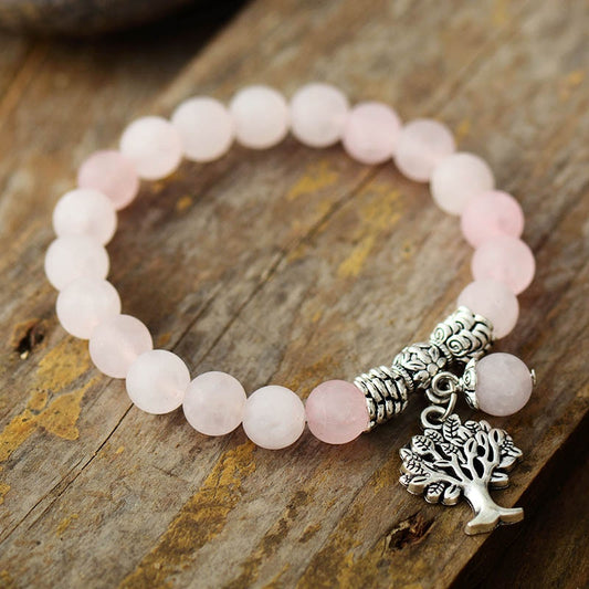 Natural Frosted Rose Quartz Tree of Life Beaded Bracelet