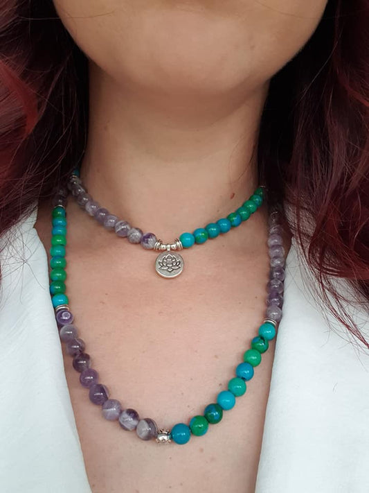 Natural Amethyst & Chrysocolla 108 Beads Mala Necklace Wrap Bracelet