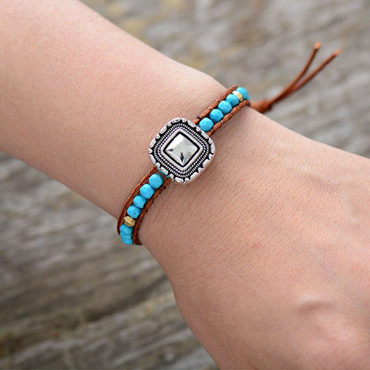 Natural Turquoise, Onyx & Crystals Leather Wrap Bracelet