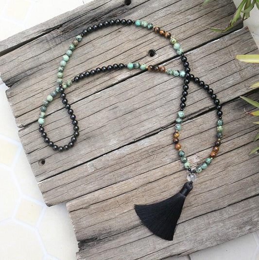 Natural Black Onyx, African Turquoise & Tiger Eye 108 Mala Beads Necklace / Bracelet