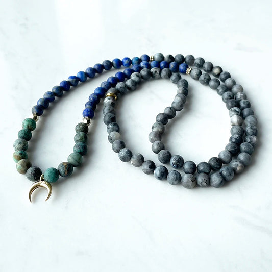 Natural Matte African Turquoise & Larvikite 108 Beads Moon Mala