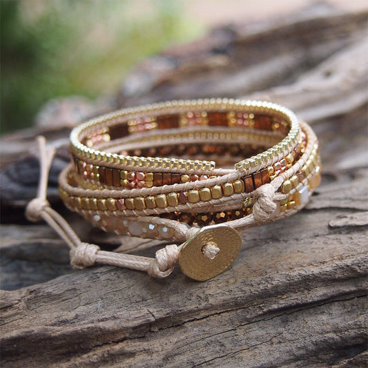 Bronze Crystal and Brass Beaded Leather Wrap Bracelet
