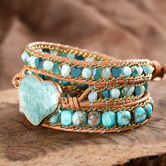 Natural Turquoise Jasper & Amazonite Heart Leather Wrap Bracelet