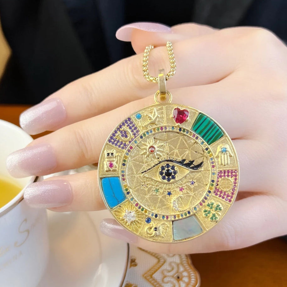 At its center shines the Evil Eye, a timeless guardian against negativity. Surrounding it, a celestial mandala of Sun, Moon, and stars in multicoloured zircons reflects the balance of cosmic energies—representing your inner universe in harmony with the Solar System. The red ruby heart embodies passion and vitality, while powerful symbols like the Hamsa Hand, Maneki Neko, four-leaf clover, elephant, dove, morning star, and horseshoe invite fortune, peace, strength, and divine favor.