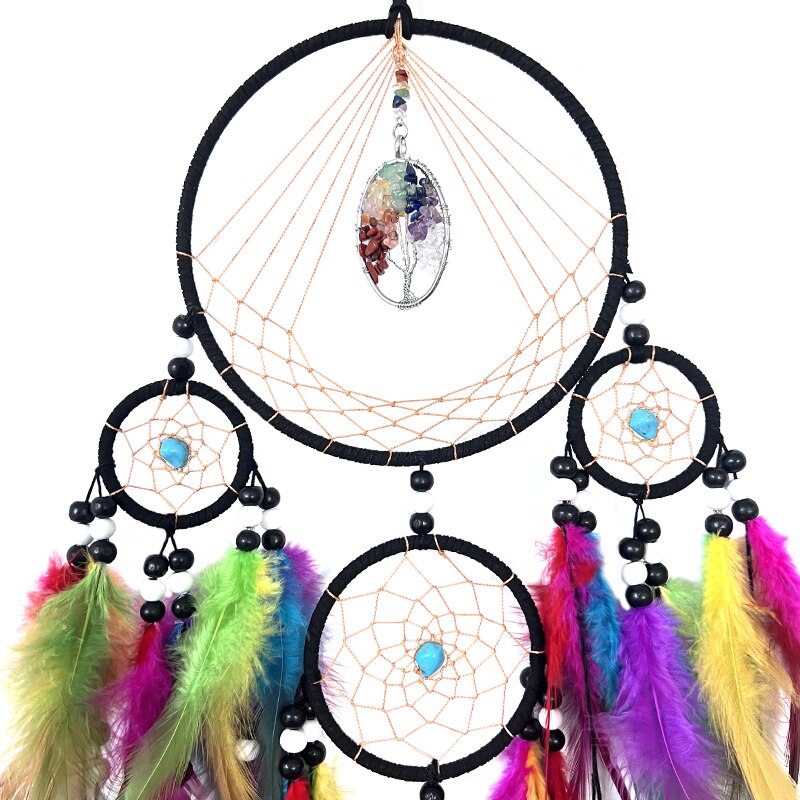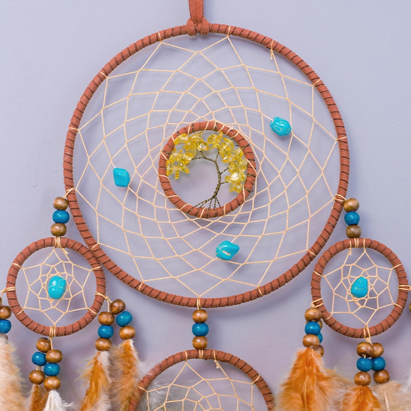 The tree of life, intricately woven with natural mixed gemstone chip beads, graces this dream catcher, representing interconnectedness, growth, and wisdom. Each gemstone carries its unique spiritual properties, infusing the piece with their subtle energies and enhancing its mystical allure.
