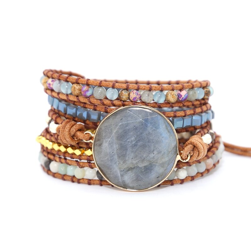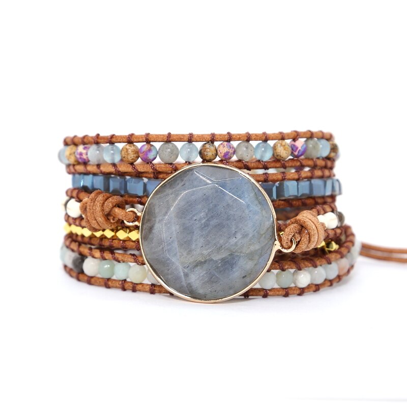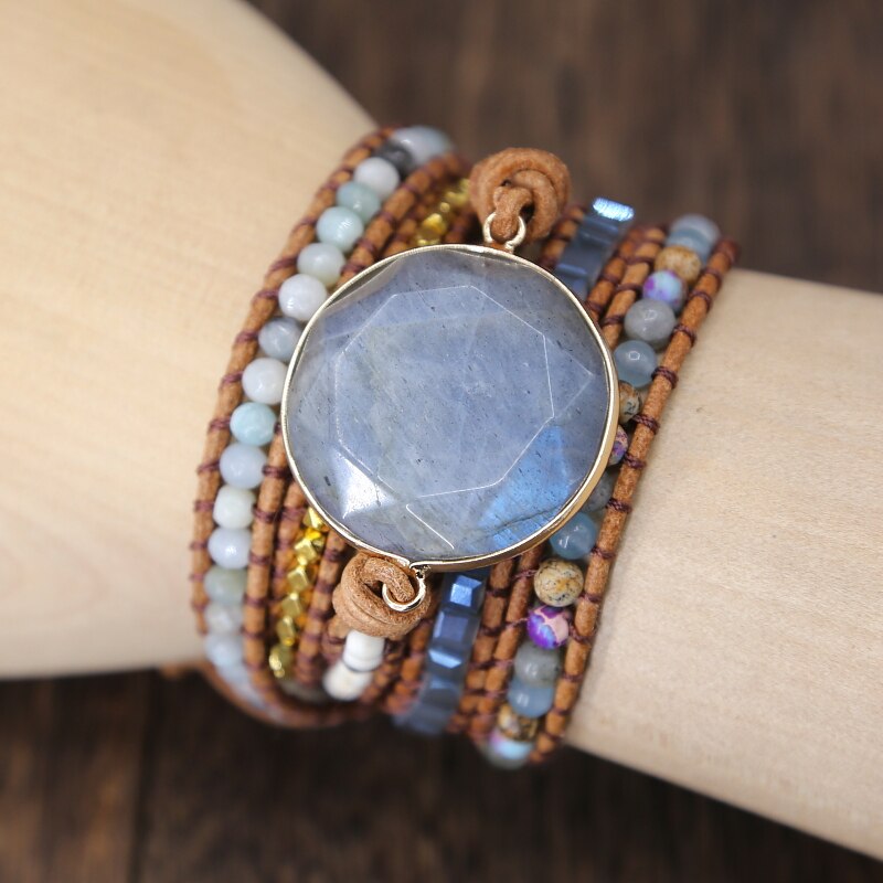 Handmade Natural Labradorite & Jasper Leather Wrap Bracelet