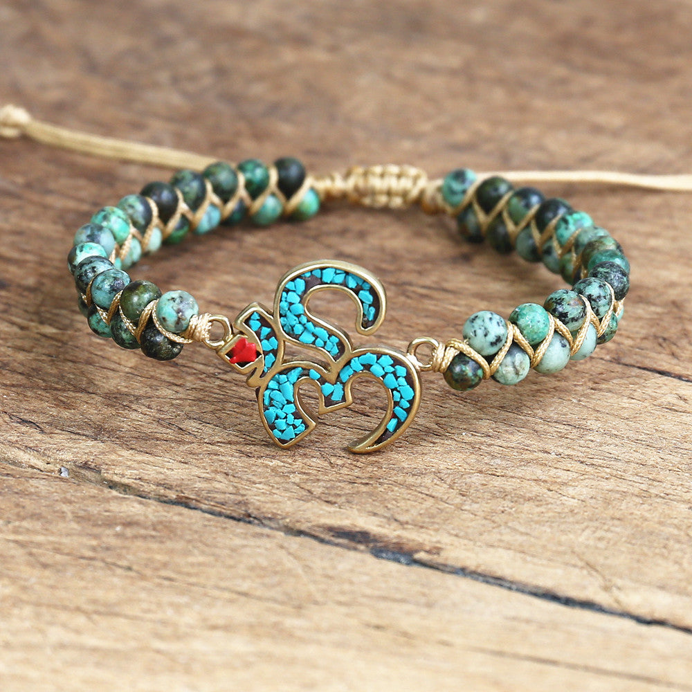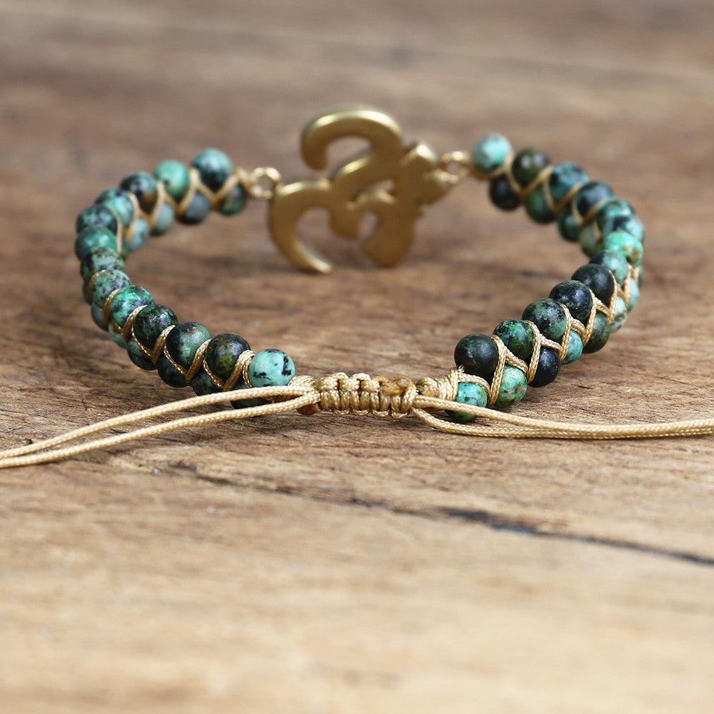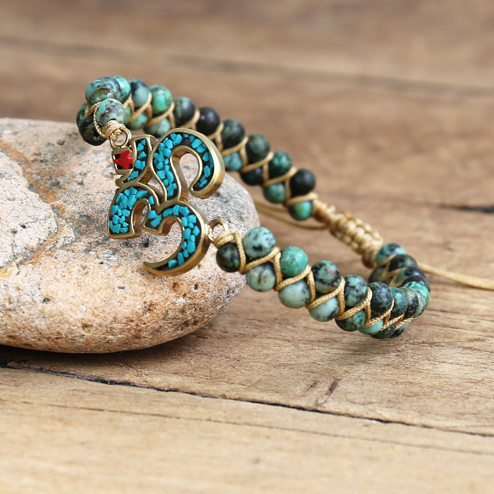 Bring good luck and positive vibes in your life with this incredibly beautiful beaded bracelet. It is carefully handmade with macrame technique: African Turquoise stone beads are "knitted together" for a stylish bohemian look! The sacred OM charm, decorated with semi-precious stones, is a reminder of your eternal nature. Mounted on vegan leather.