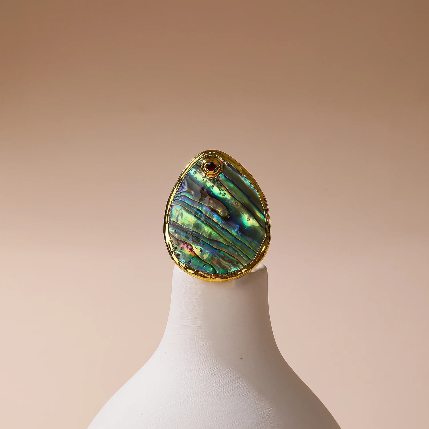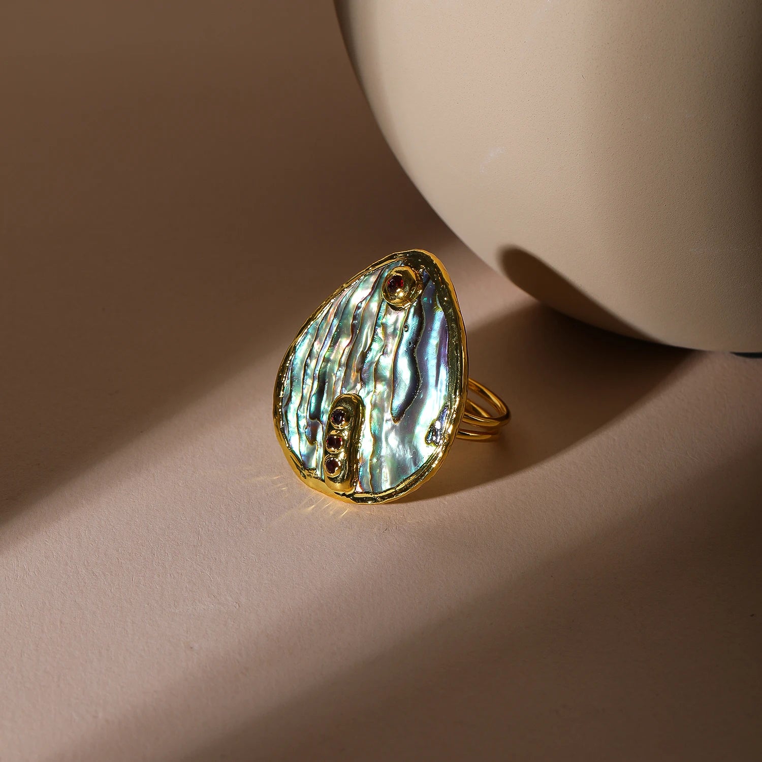 Crafted with a luminous natural Abalone shell, each ring reveals iridescent waves of colour, reflecting light in soft greens, blues, and pearlescent hues — no two pieces are ever the same ✨