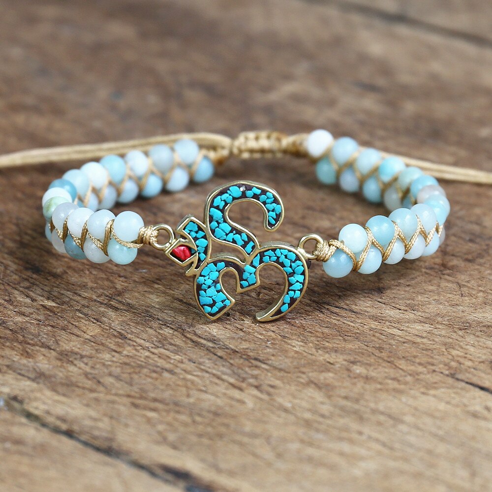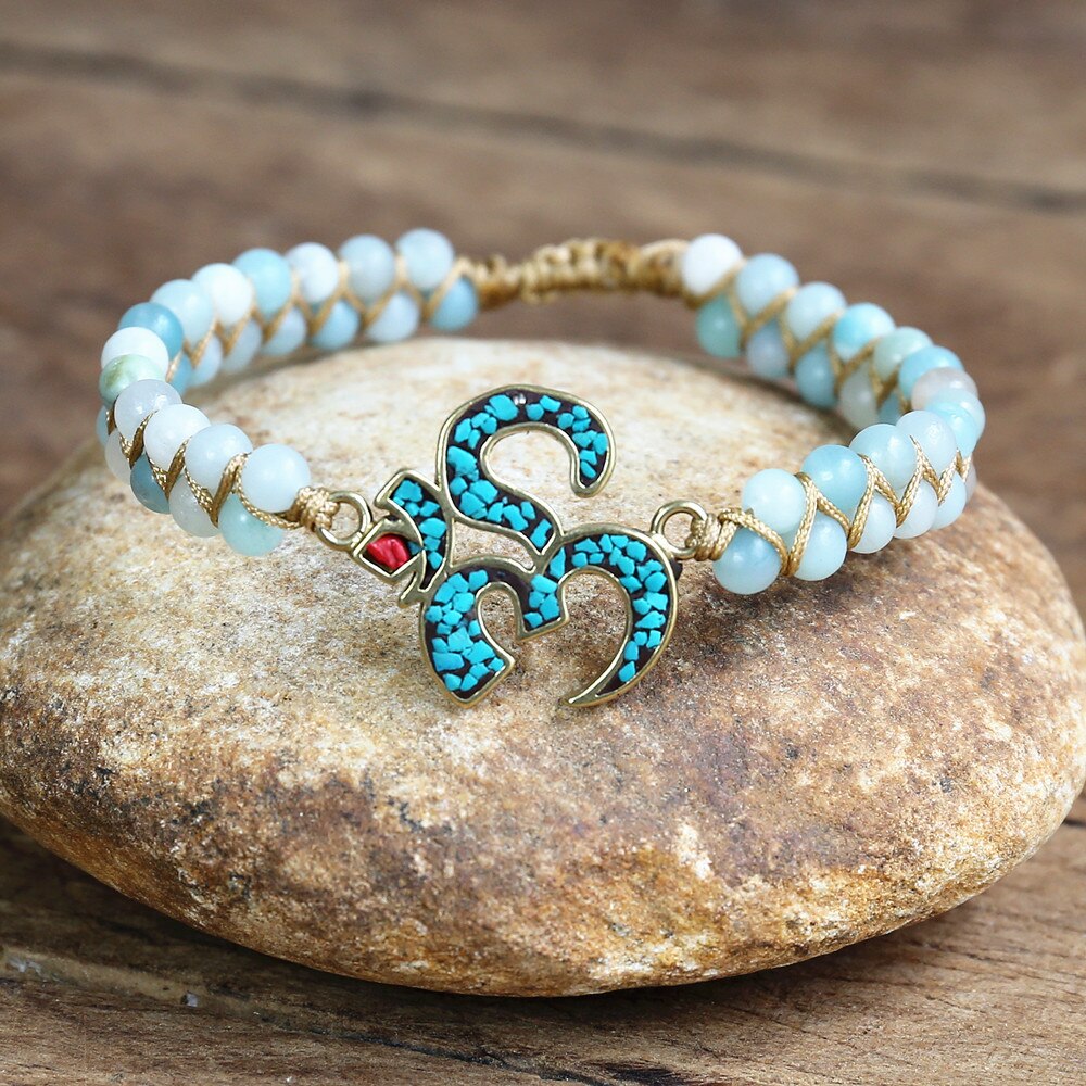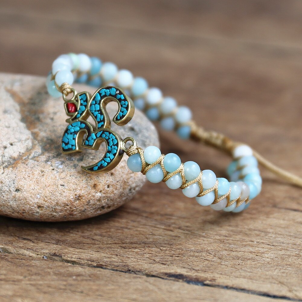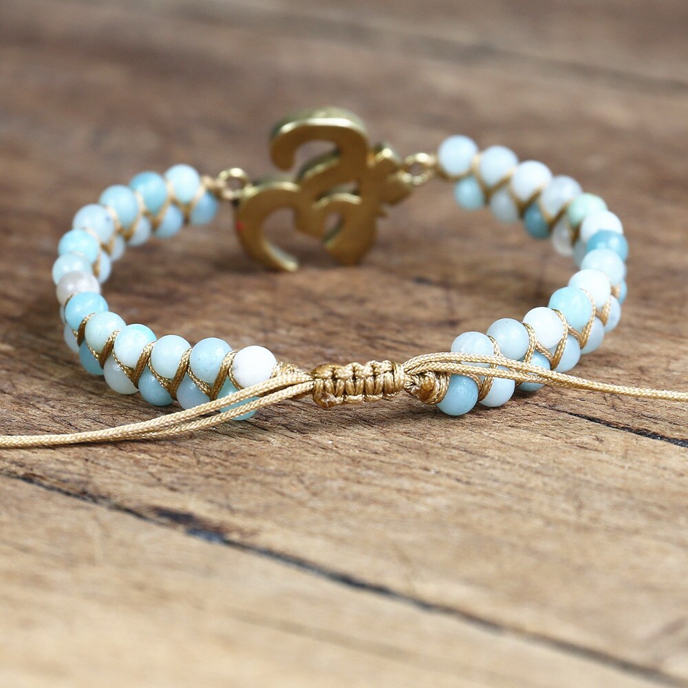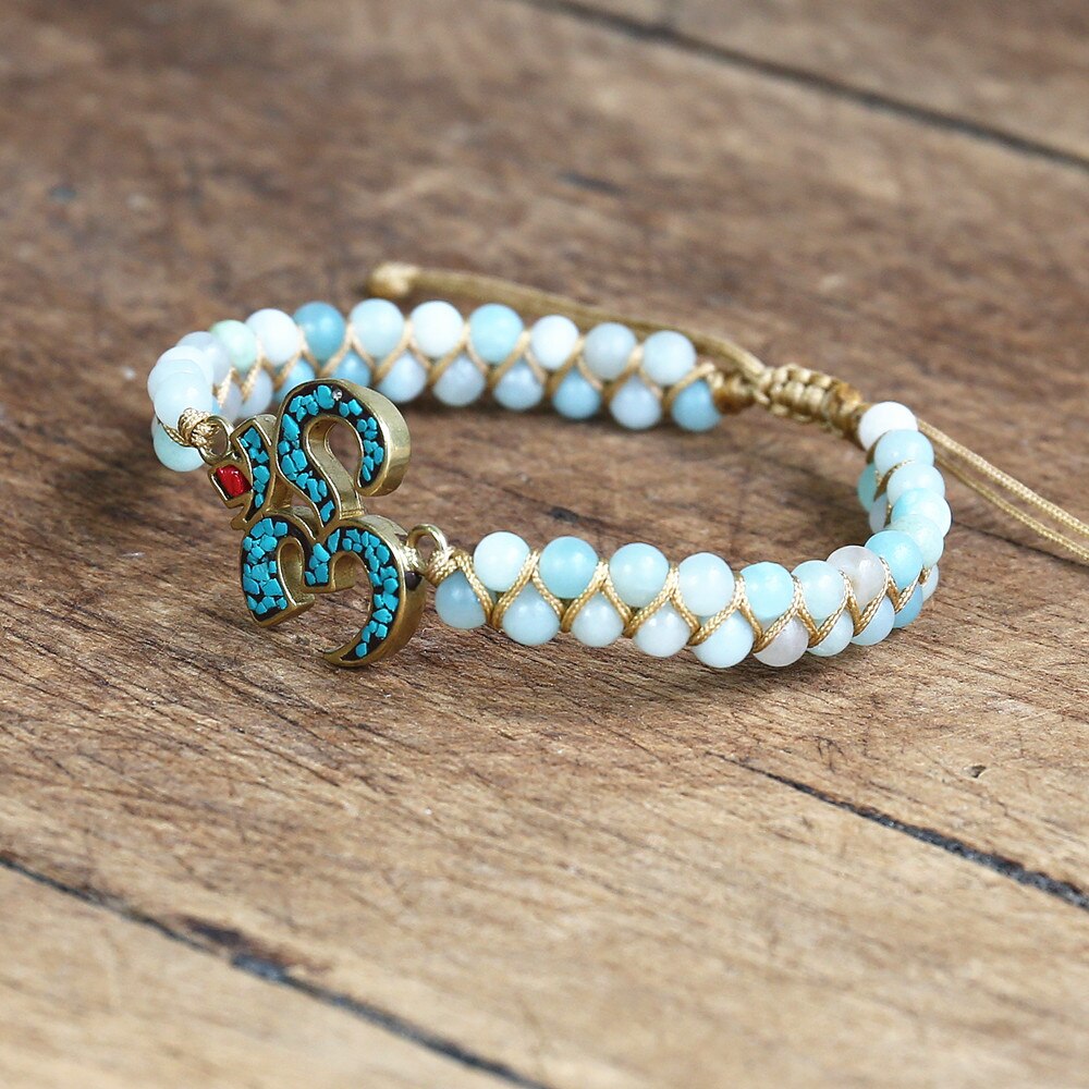 Bring good luck and positive vibes in your life with this incredibly beautiful beaded bracelet. It is carefully handmade with macrame technique: Amazonite beads are "knitted together" for a stylish bohemian look! The sacred OM charm, decorated with a mosaic of semi-precious stone chips, is a reminder of your eternal nature. It is mounted on vegan leather and easily adjustable to fit 6.5 - 7.5 inches wrists (16.5 cm to 19 cm). Bead size is 4mm. .