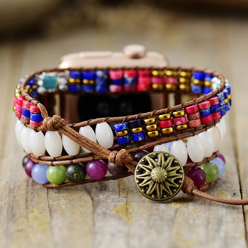 Bring love and grounding in your life with this wonderful Apple Watch Band. This unique watch strap is beautifully handmade with various natural Jasper, Onyx and crystal beads. It is mounted on vegan leather and comes in 3 different sizes: small (48 cm), medium (53 cm) or large (56 cm). Each size is adjustable. Compatible with 38-49mm Apple Watch faces. Pick your Apple Watch face size in the drop-down menu!