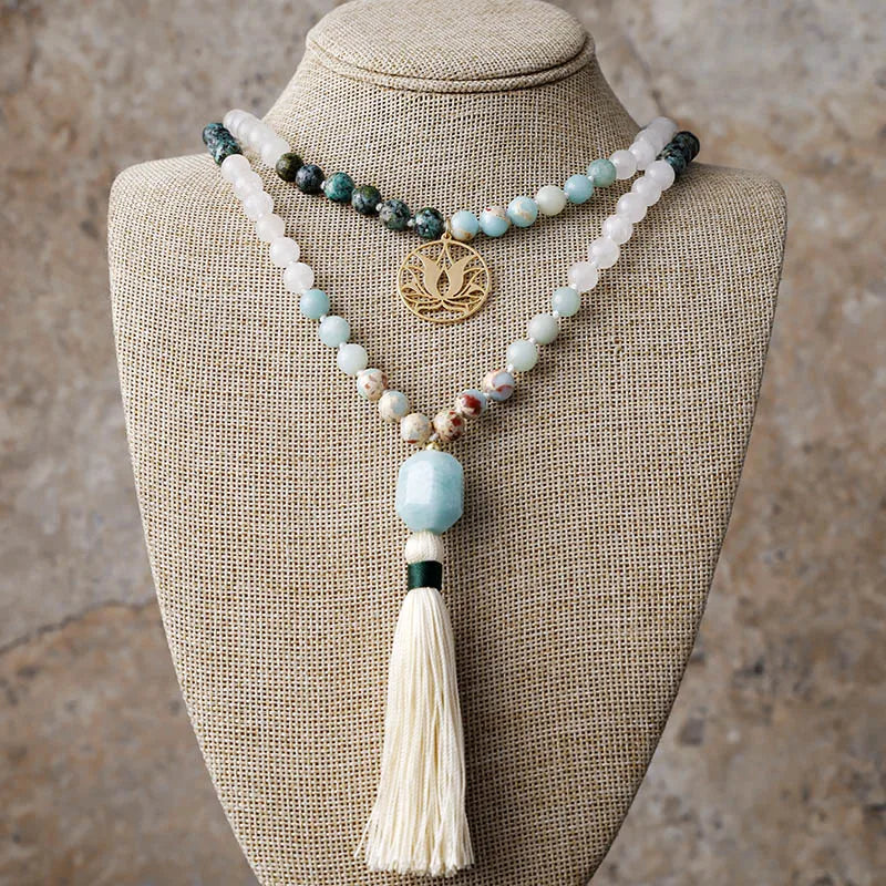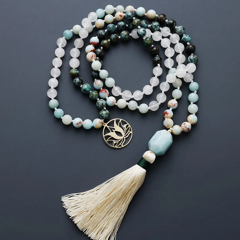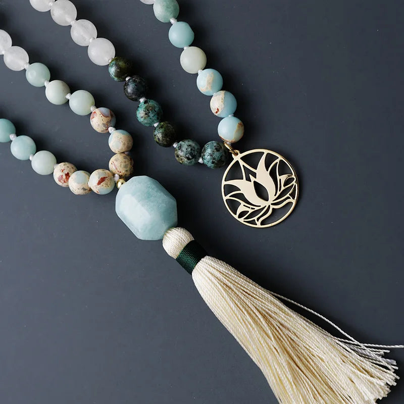 Handcrafted with Natural Blue Jasper, Rose Quartz, and Imperial Jasper beads (8mm), each stone carries unique properties: Blue Jasper enhances communication; Rose Quartz brings love and compassion; and Imperial Jasper promotes emotional healing. The large Amazonite pendant fosters tranquility and harmony, while the lotus flower pendant symbolizes purity and spiritual awakening.