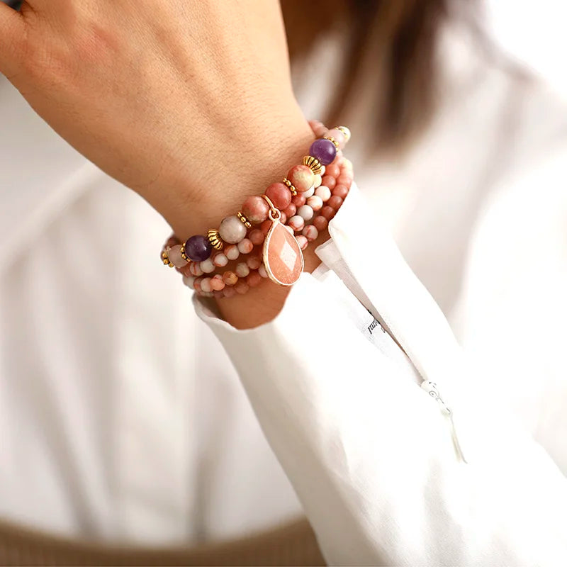 🌀 Metaphysical Properties: Crafted from natural Pink Zebra Jasper 4mm beads and complemented with 8mm Jasper and Amethyst beads, this Mala harmonizes the body’s energy centers. Pink Zebra Jasper is known for its nurturing energy, enhancing tranquility and compassion, and is associated with the Heart Chakra. Amethyst, resonating with the Third Eye and Crown Chakras, promotes spiritual awareness and inner peace. These stones are beneficial for all zodiac signs, offering protection and emotional stability.