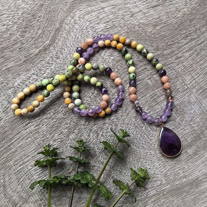 Awaken Your Spirit ā Natural Rhodochrosite, Amethyst, Sunstone & Jade 108 Beads Mala Set āØ