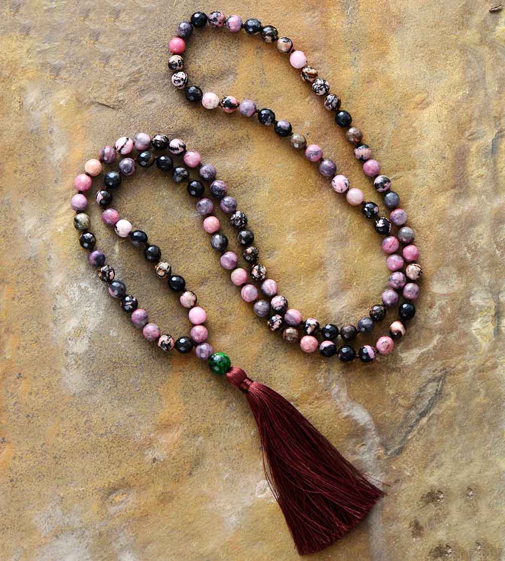 This incredible Mala necklace is beautifully handmade with 108 natural Rhodonite beads. It also features a soft tassel and a Green Jasper pendant. It can be worn as a necklace, a wrap bracelet or used for meditation. Beads size is 8mm. Length is about 38 inches (96.5 cm).