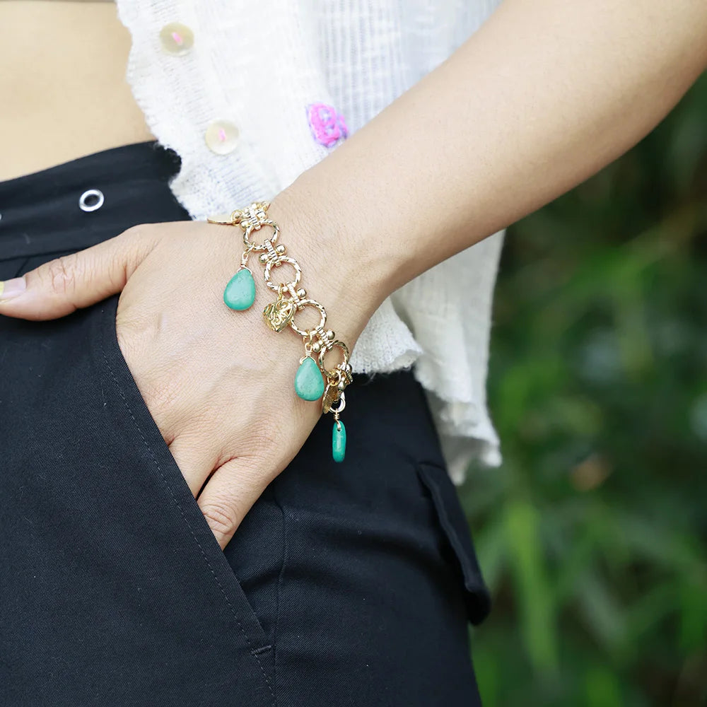 Infuse your everyday look with soulful charm. This boho-chic chunky chain bracelet features natural Turquoise and Green Quartz pendants — a handcrafted piece made to ground, protect, and uplift your energy.